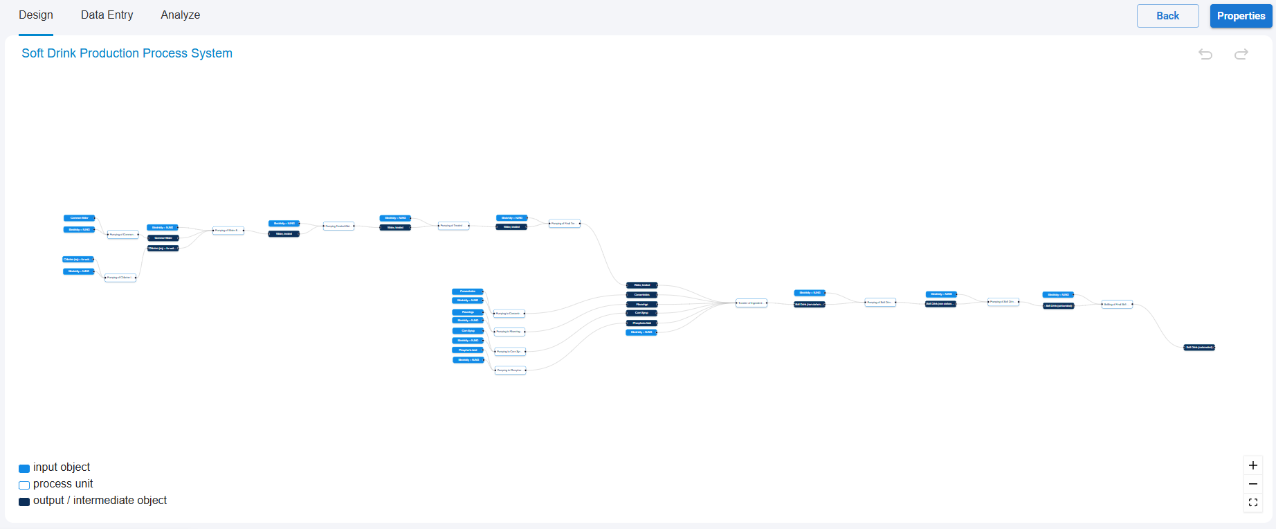 The software allows you to create multiple processes in the system, each representing a different department, product line, or facility. By connecting inputs, processes, and outputs, you build a customized model of your carbon footprint.