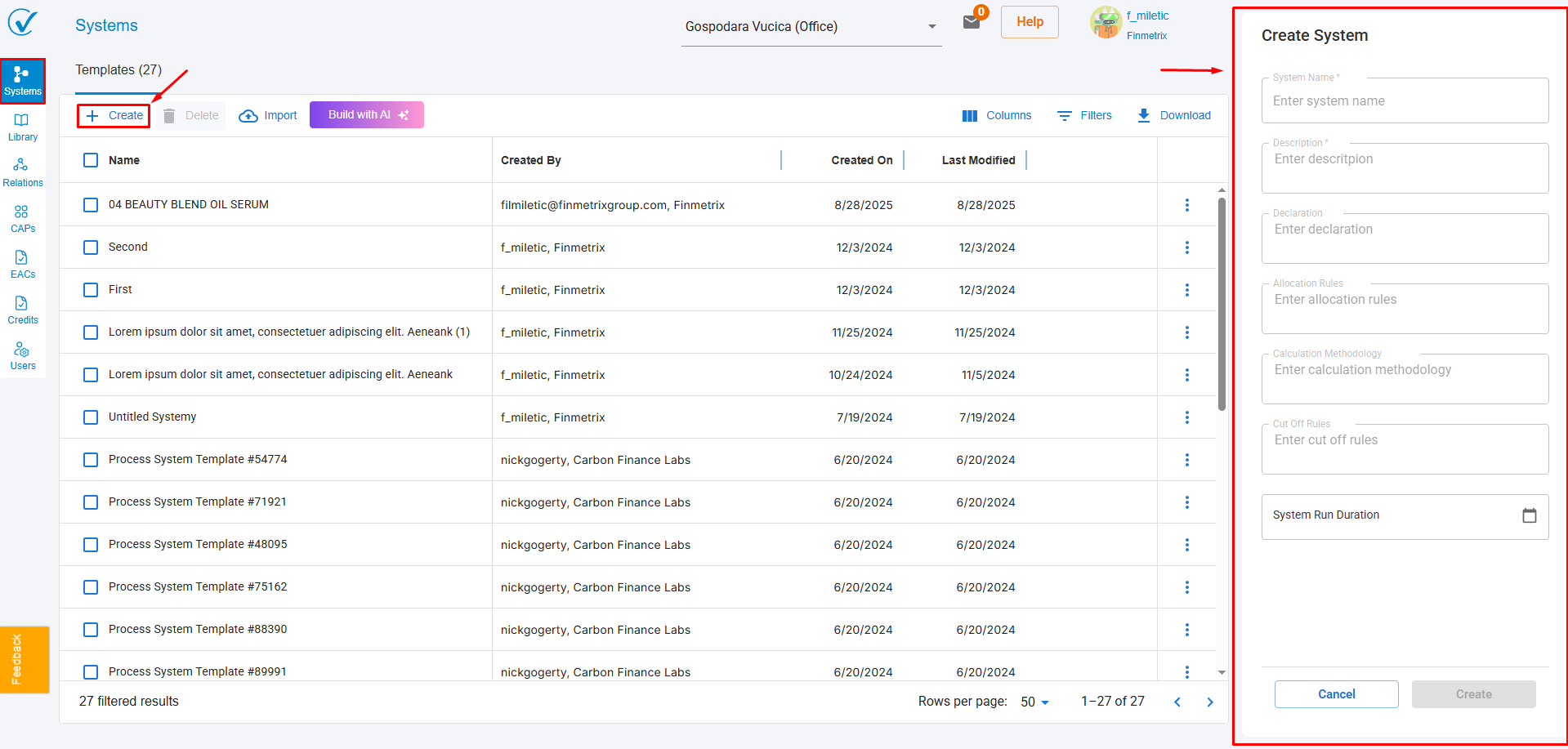 Clicking "Create" opens a drawer on the right side where you'll define your system details. These include: