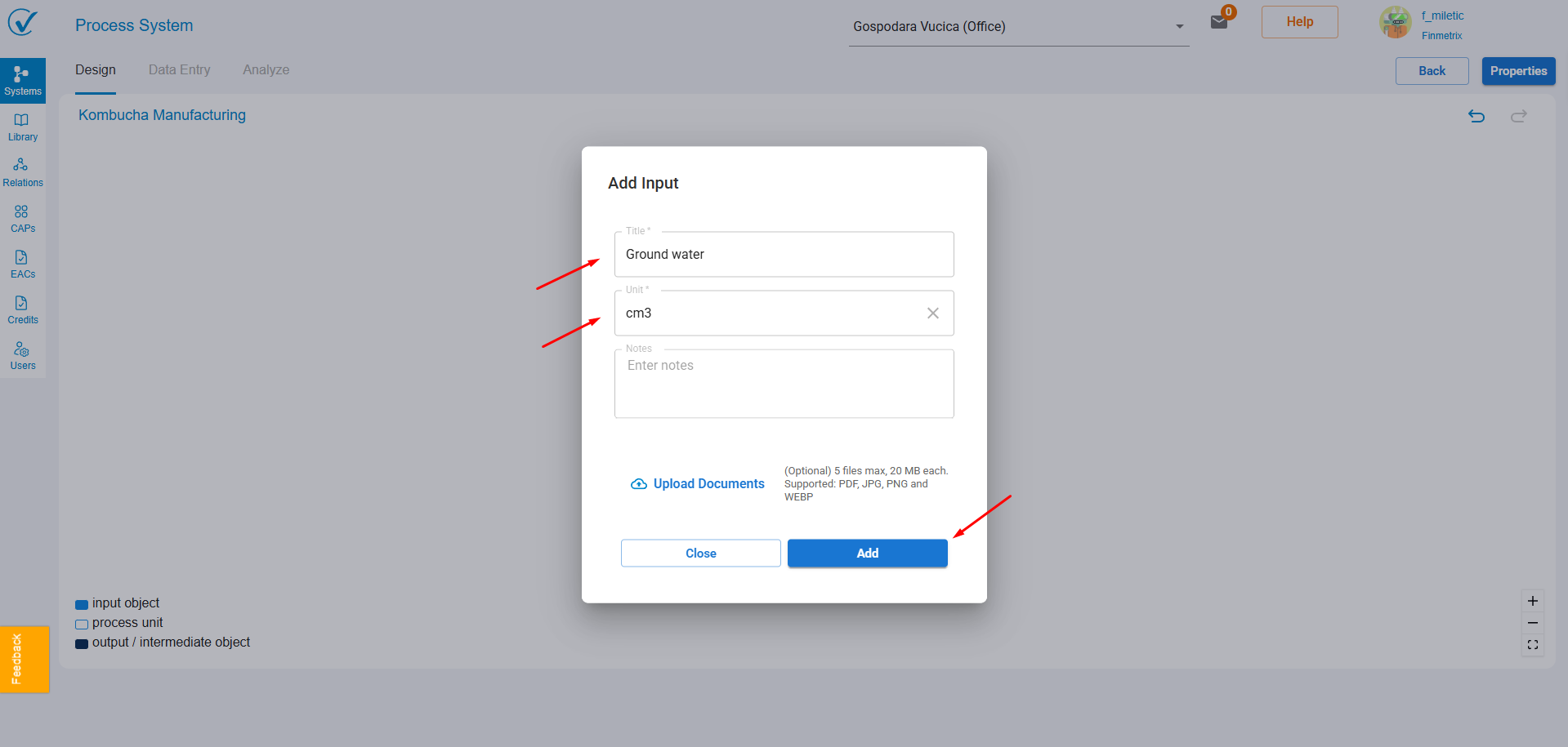 When you right-click on a process and choose "Add Input" or "Add Output," a modal window will appear on your screen. Enter the input's name as well as it's unit. Optionally, notes about the input may be added and documents may be uploaded linked to the input as well. These nodes represent various sources of emissions (inputs) or resulting footprints (outputs) that can be commonly encountered in different industries and activities.