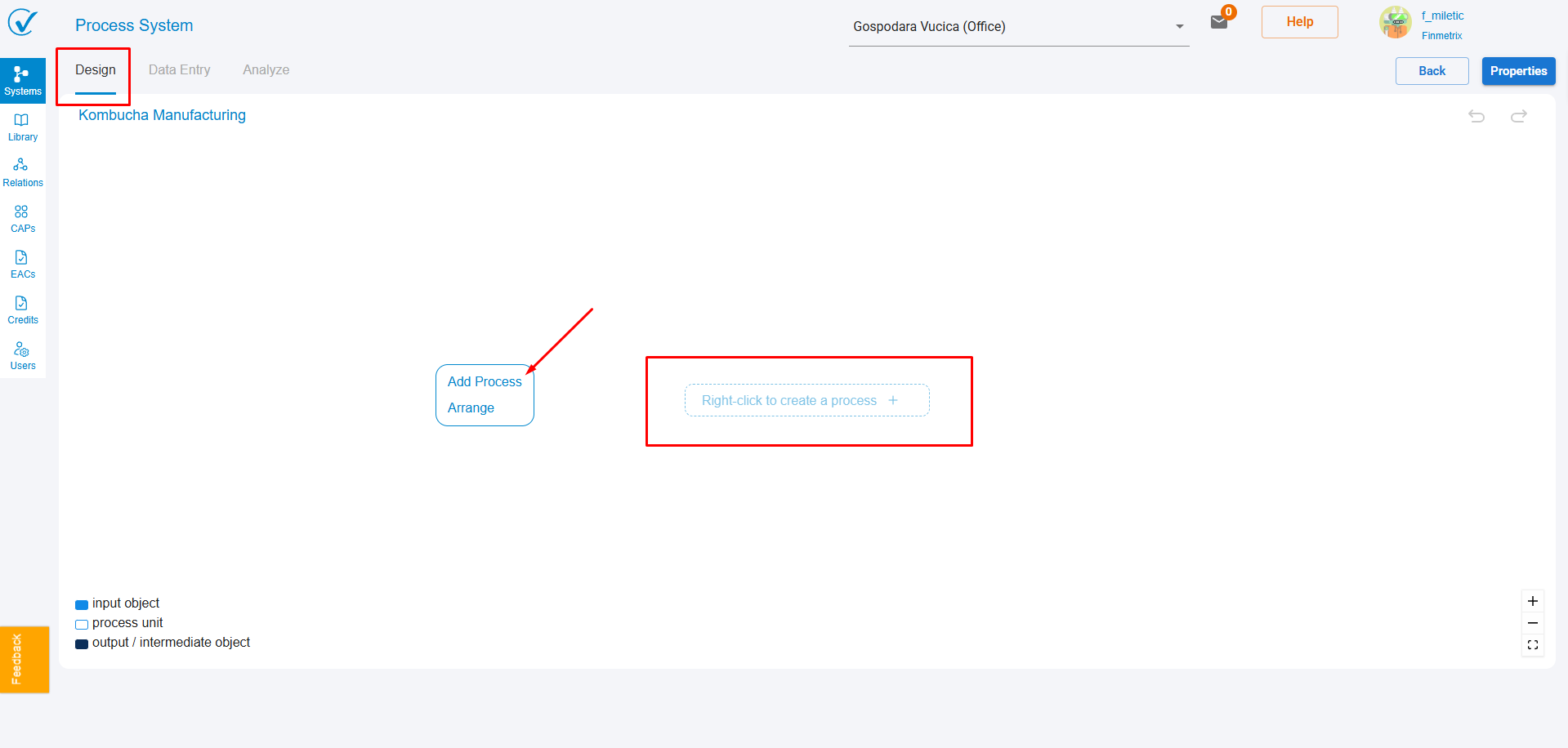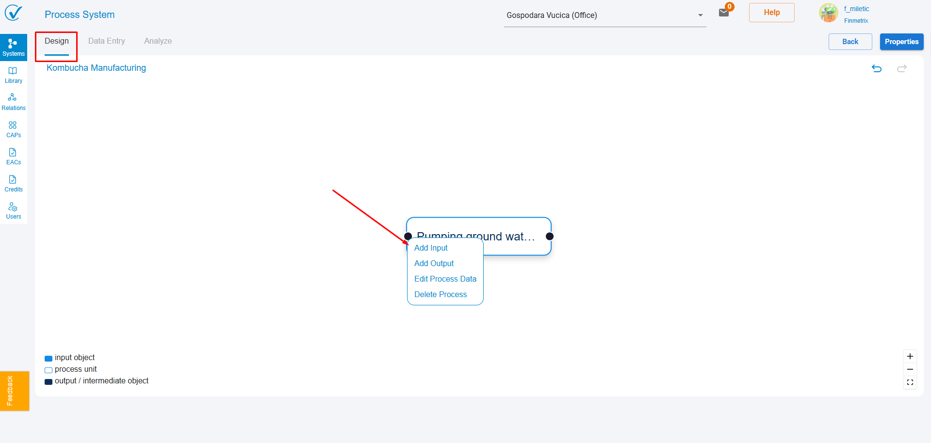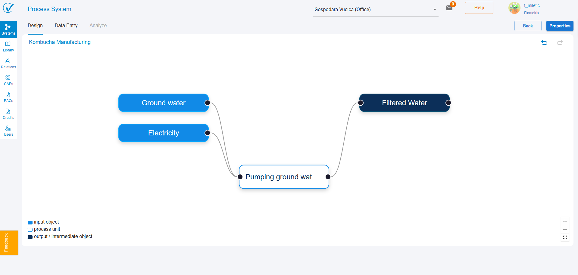 The inputs/outputs you create within the modal window plays a crucial role in accurately representing your carbon footprint. Create nodes that accurately reflect the sources of emissions and resulting footprint associated with your processes. Once the system template is done, you may enter the corresponding data to these inputs and outputs in the Data Entry mode of the System Builder