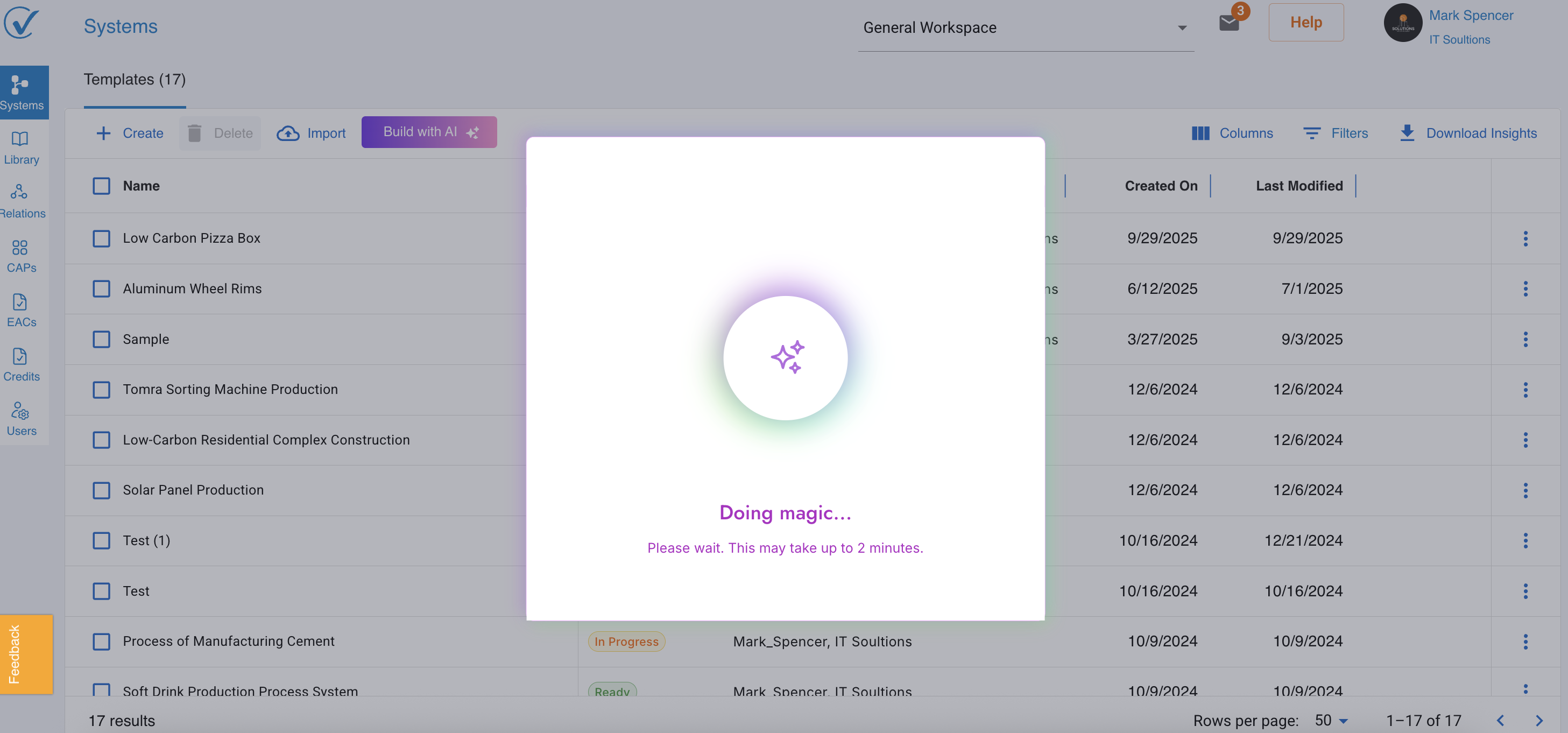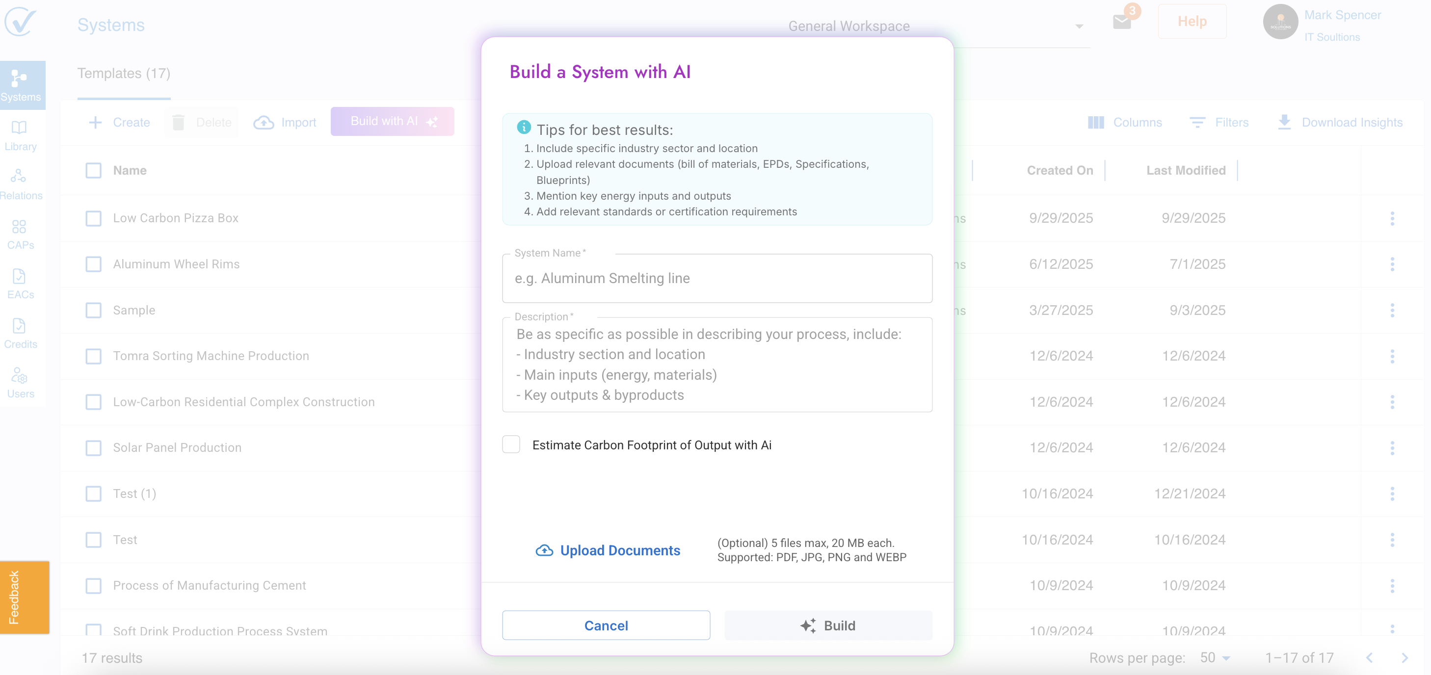 The Build with AI feature revolutionizes how you create system templates in CarbonSig. Using advanced artificial intelligence, this powerful tool automates the creation of detailed system templates that accurately replicate the carbon footprint processes of any product or activity, significantly reducing setup time while delivering tailored, precise results.