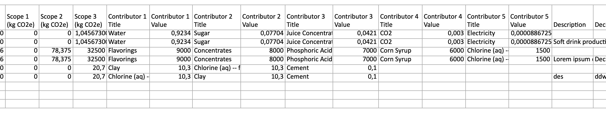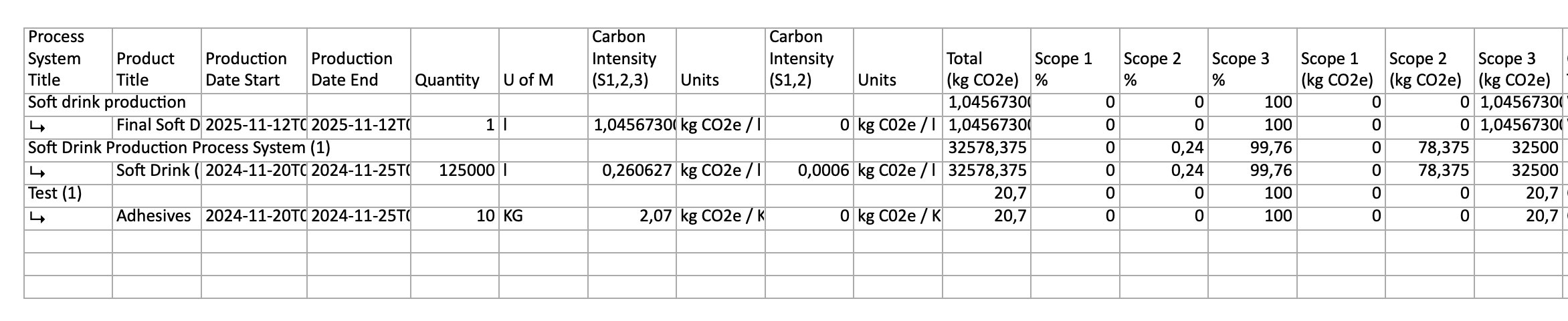 Technical: structured data export, system-level aggregation, product-level breakdown, AI-friendly formatting, hierarchical data structure, XLSX export, workspace analytics API, carbon footprint aggregation