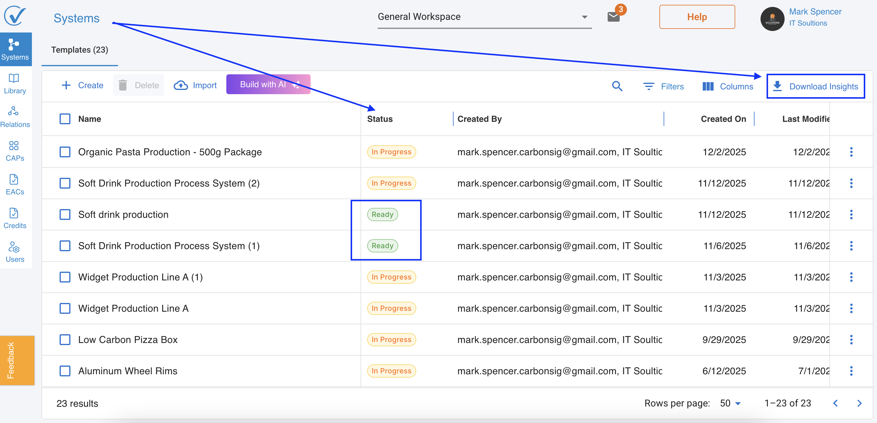 Primary: Insight Hub, workspace analytics, system export, carbon data export, analytics export, Download Insights, workspace metrics, aggregated emissions data