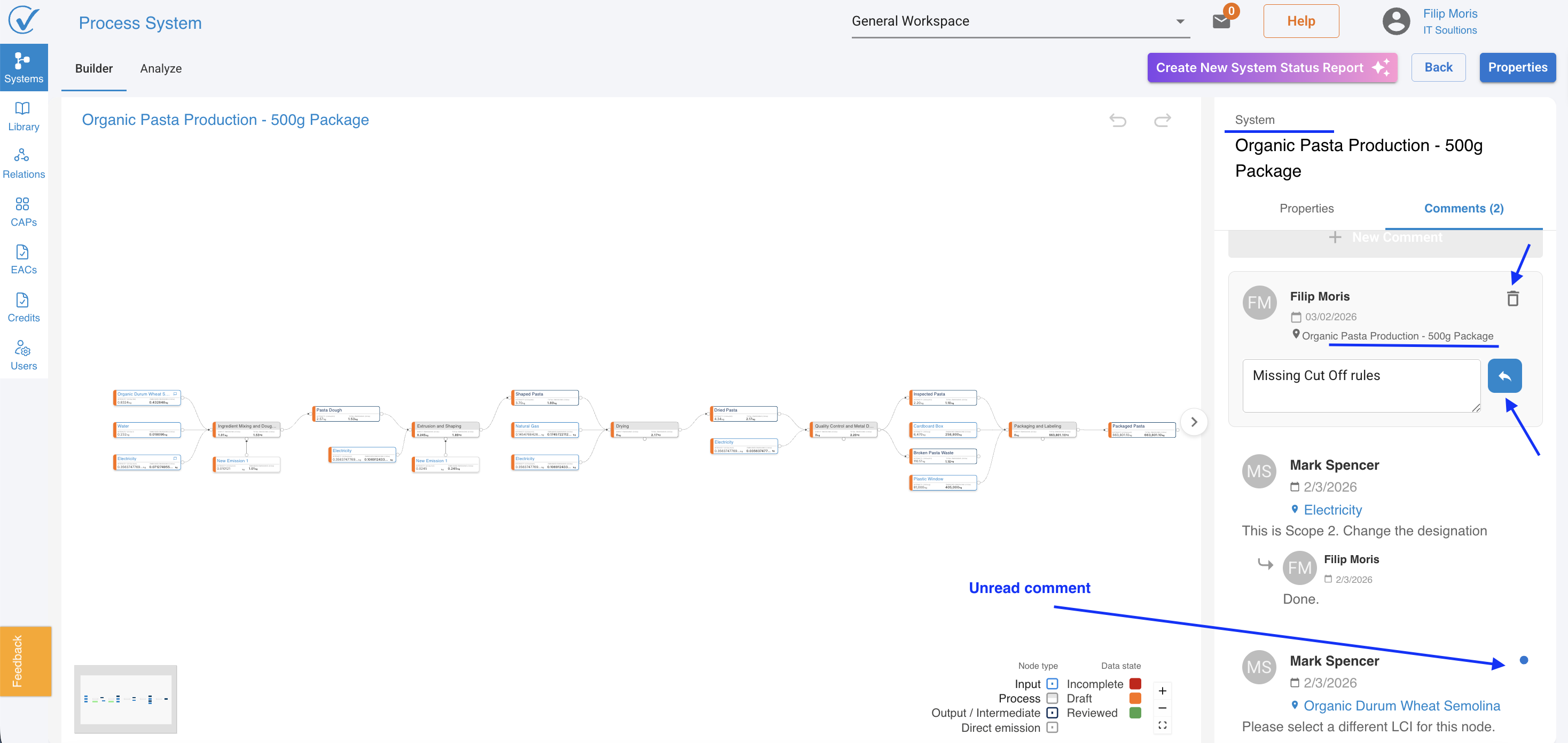 - Node-level comments attach to specific inputs, outputs, processes, or direct emissions