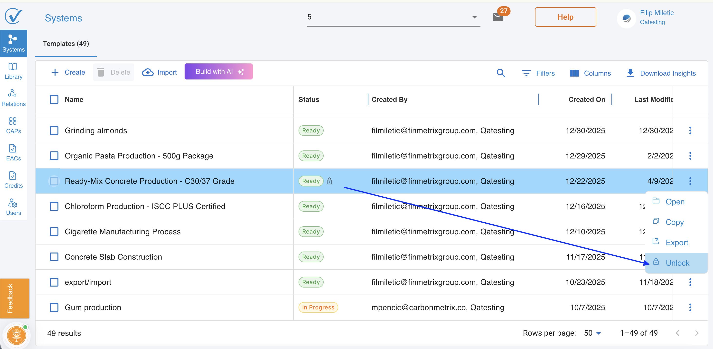 Any Admin or Editor can unlock a system at any time. Select the locked system and choose Unlock from the action menu or the three-dot menu.
