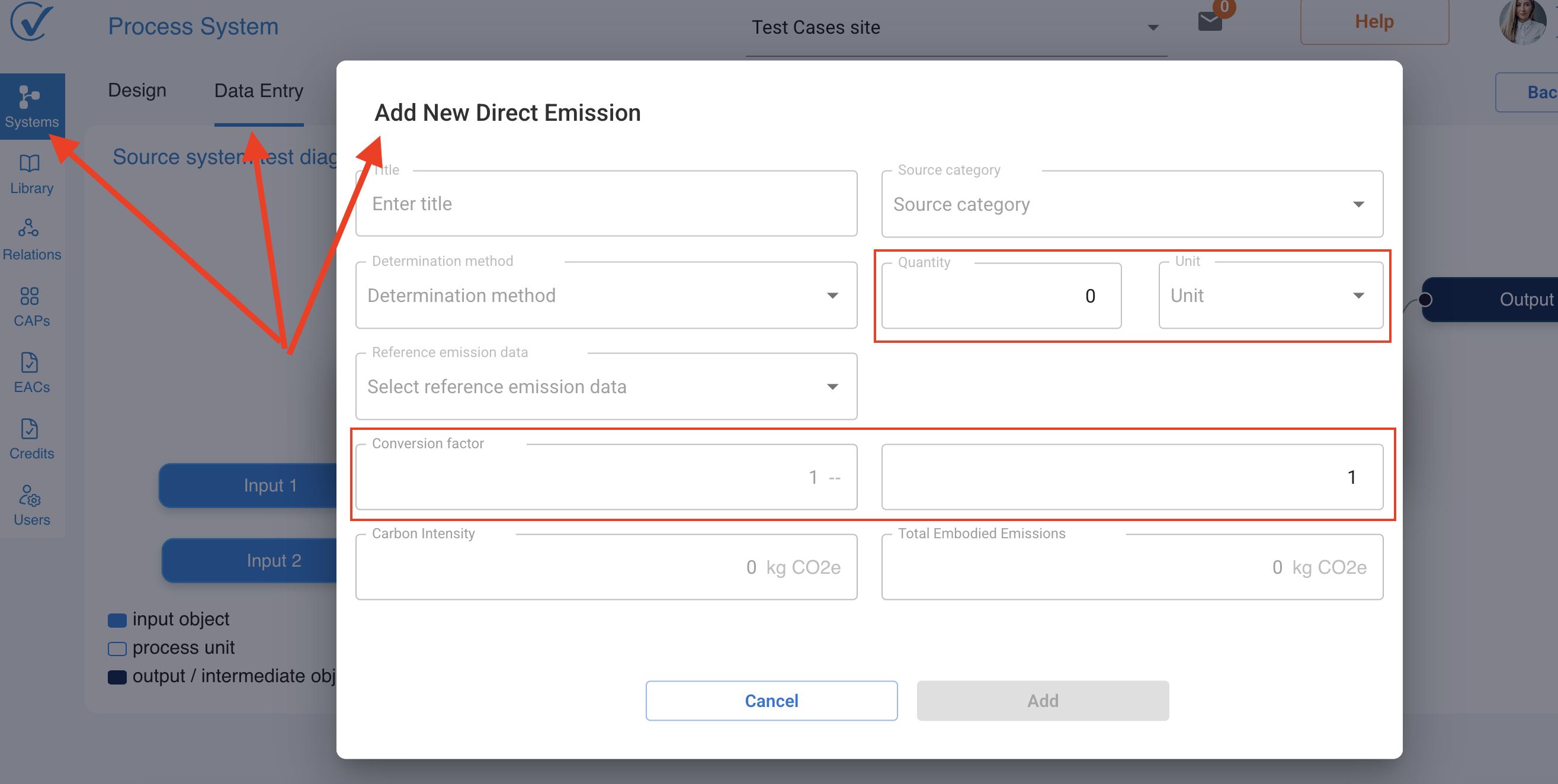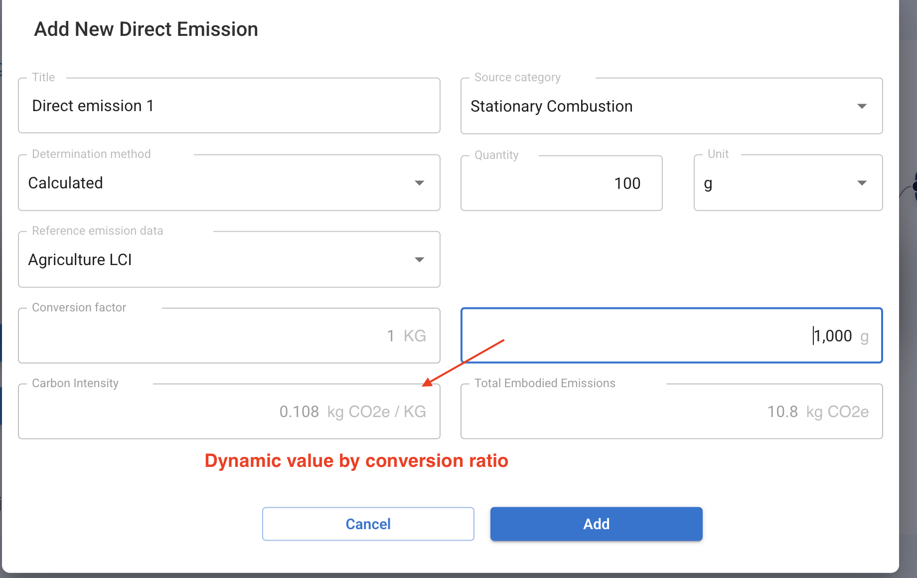 We've redesigned the Direct Emissions modal to include integrated unit conversion capabilities:
