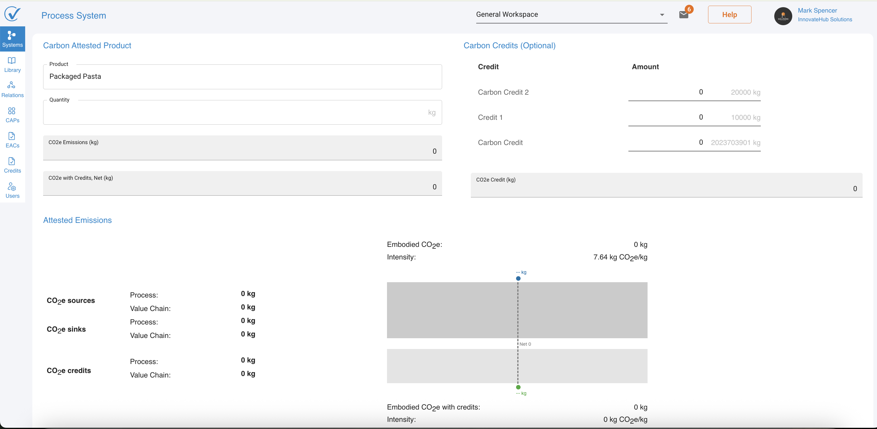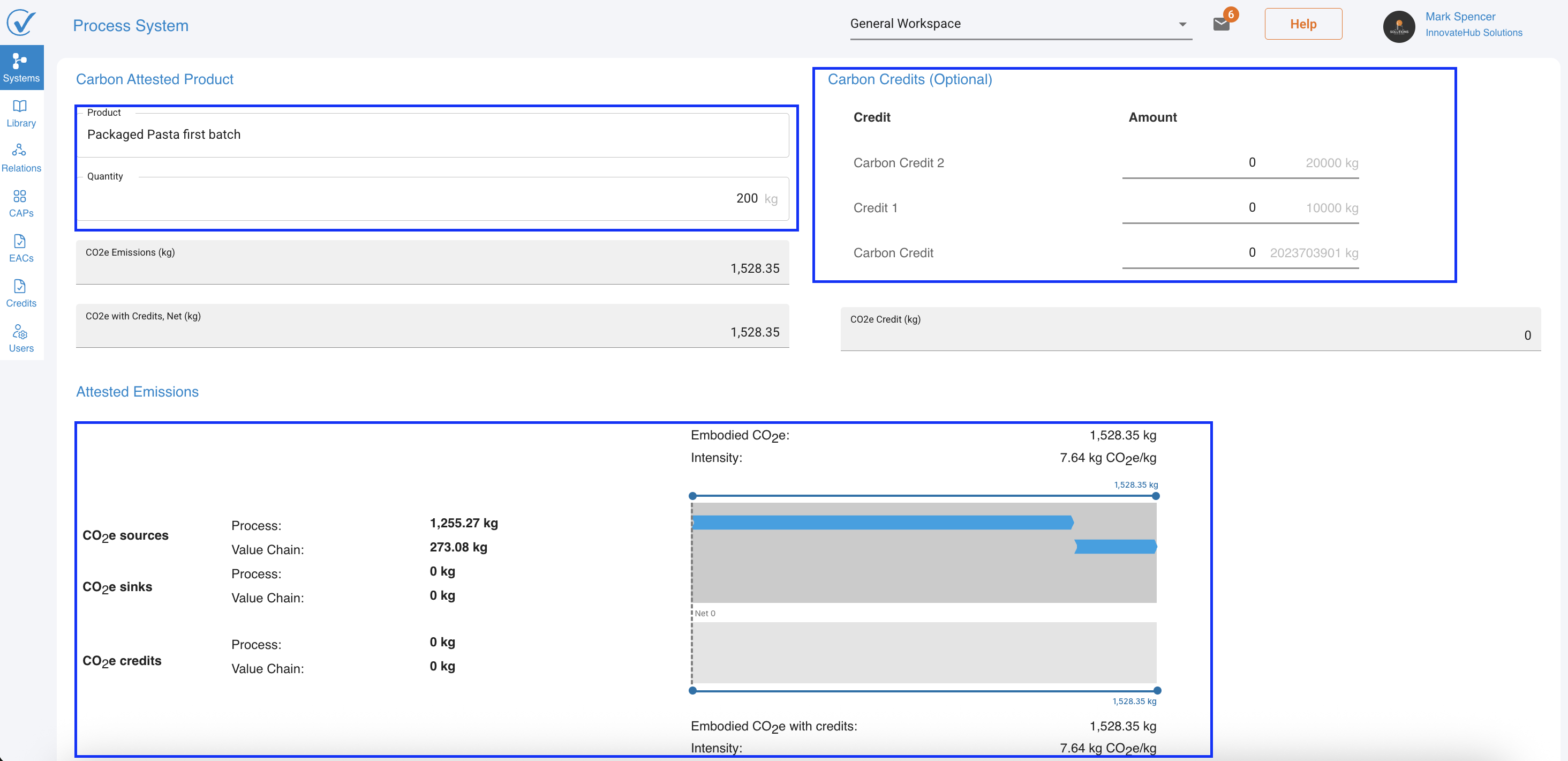 - Embodied CO2e: Total emissions before credits (e.g., 1,528.35 kg)