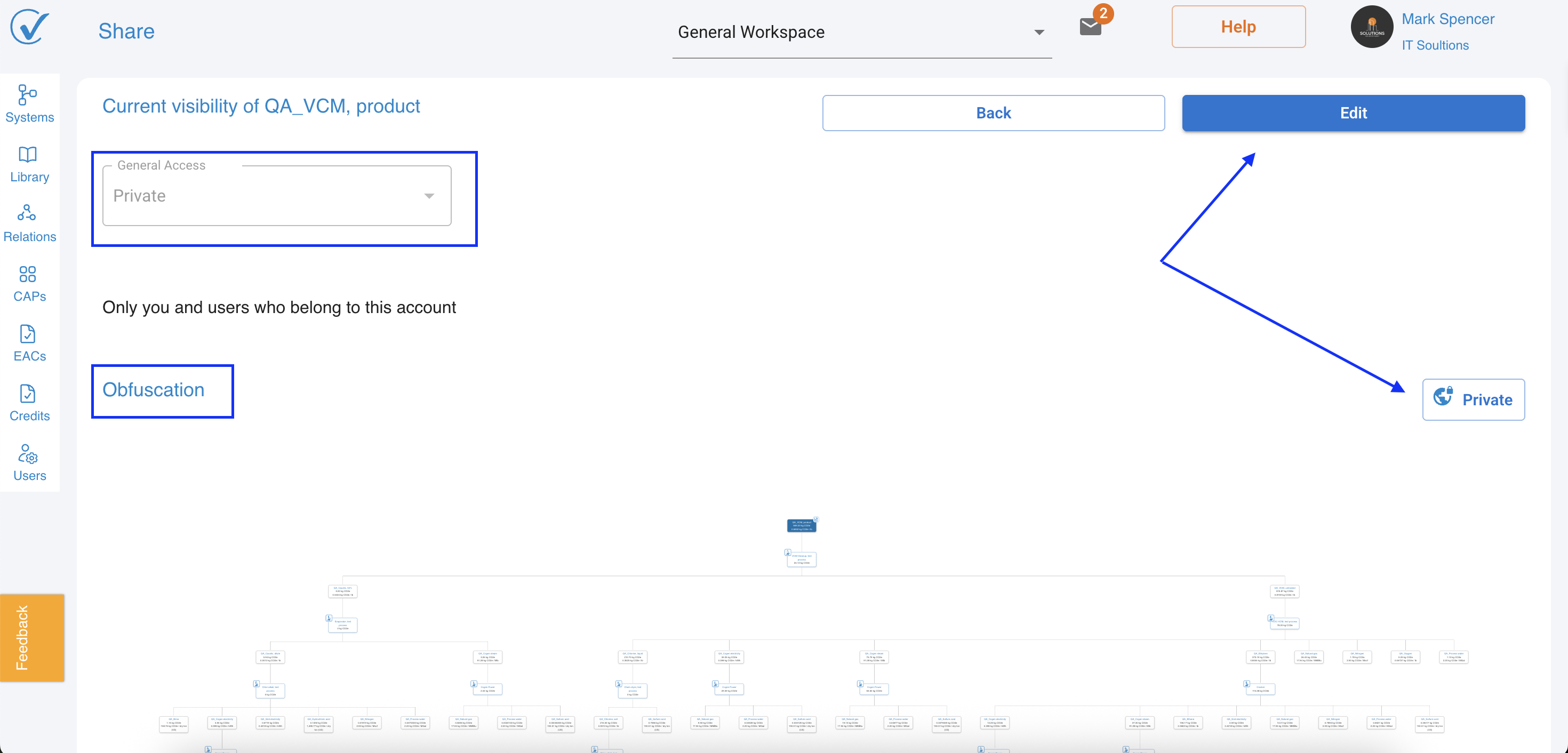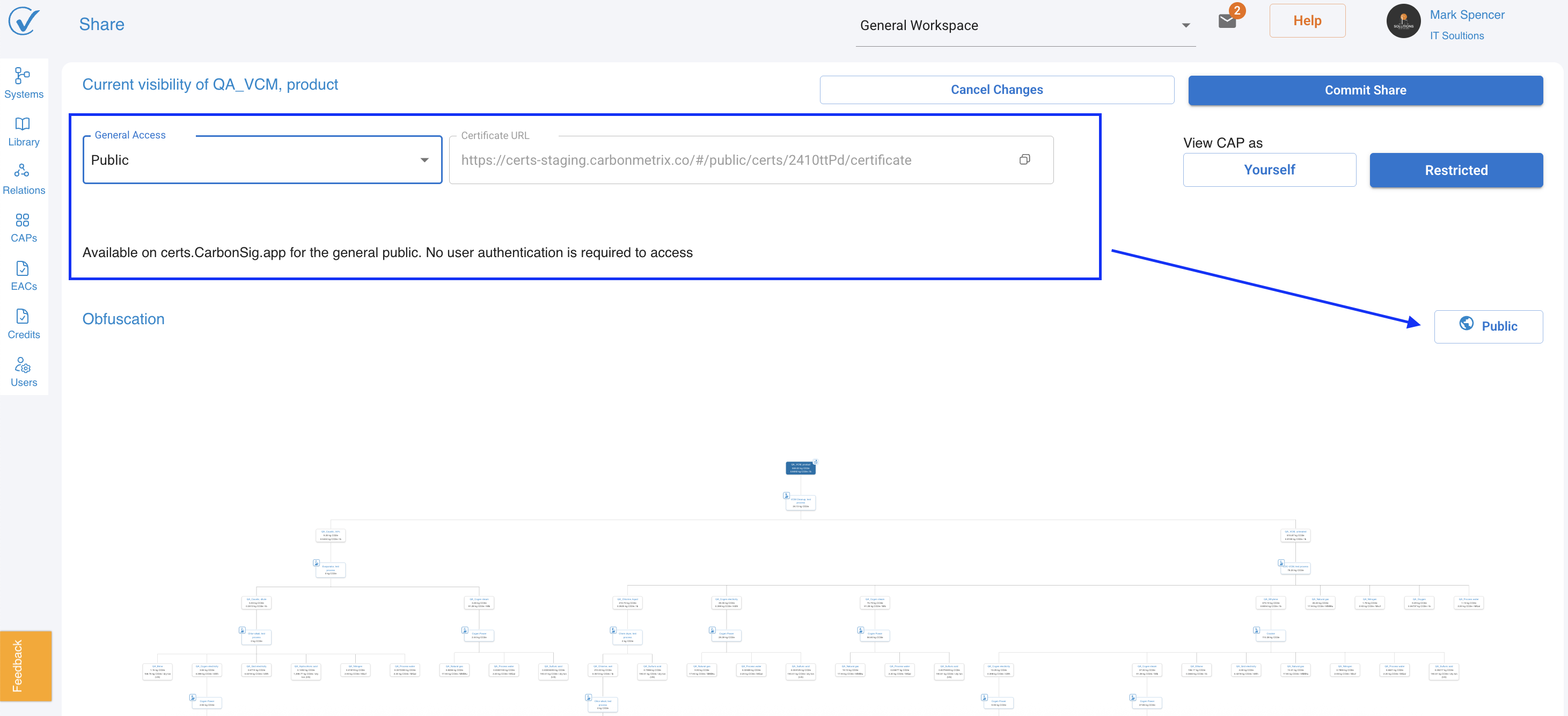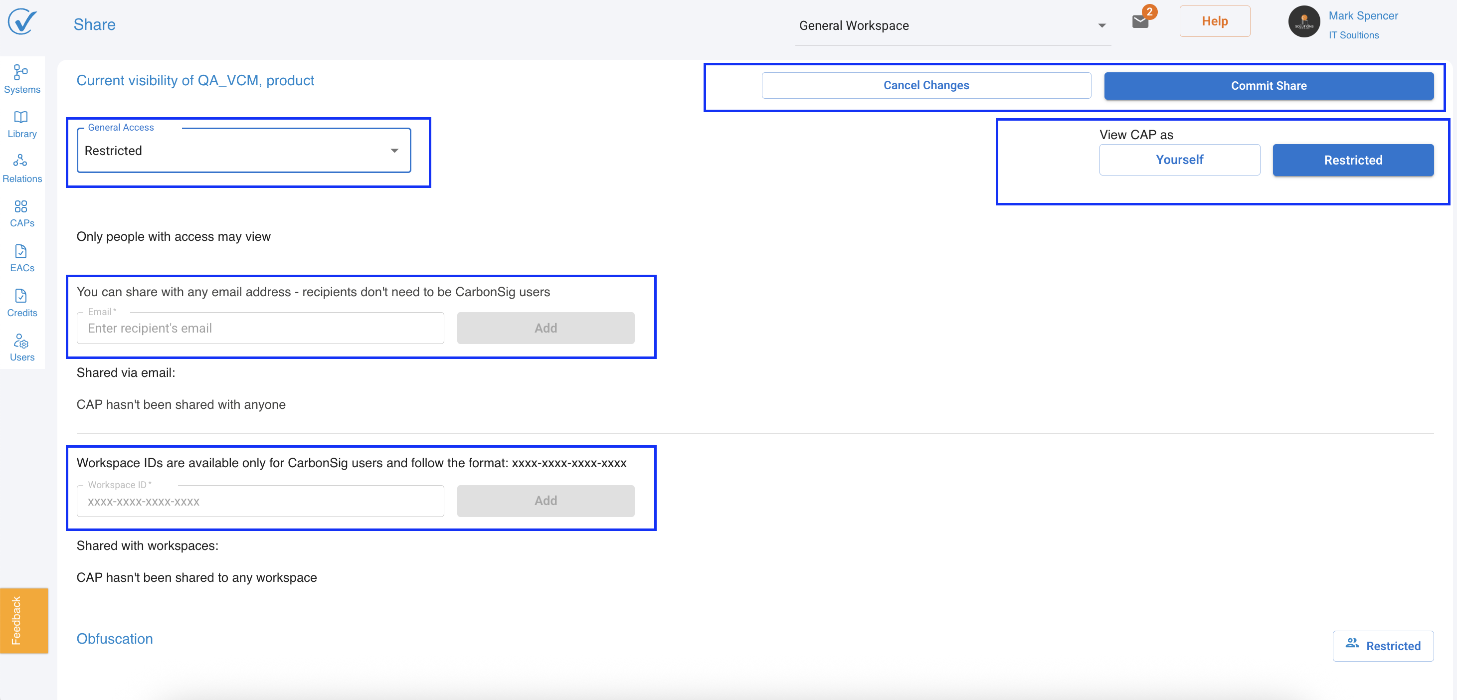 The Share feature allows users to grant permission to view a specific CAP. It enables diverse sharing methods for a single attestation unit, creating multiple versions for different audiences. Accessible through the Product Explorer page, the Share option provides various sharing choices, including Private (limited to the workspace level), Public, and Restricted protected with one/time password. Users can also utilize the Obfuscation option.