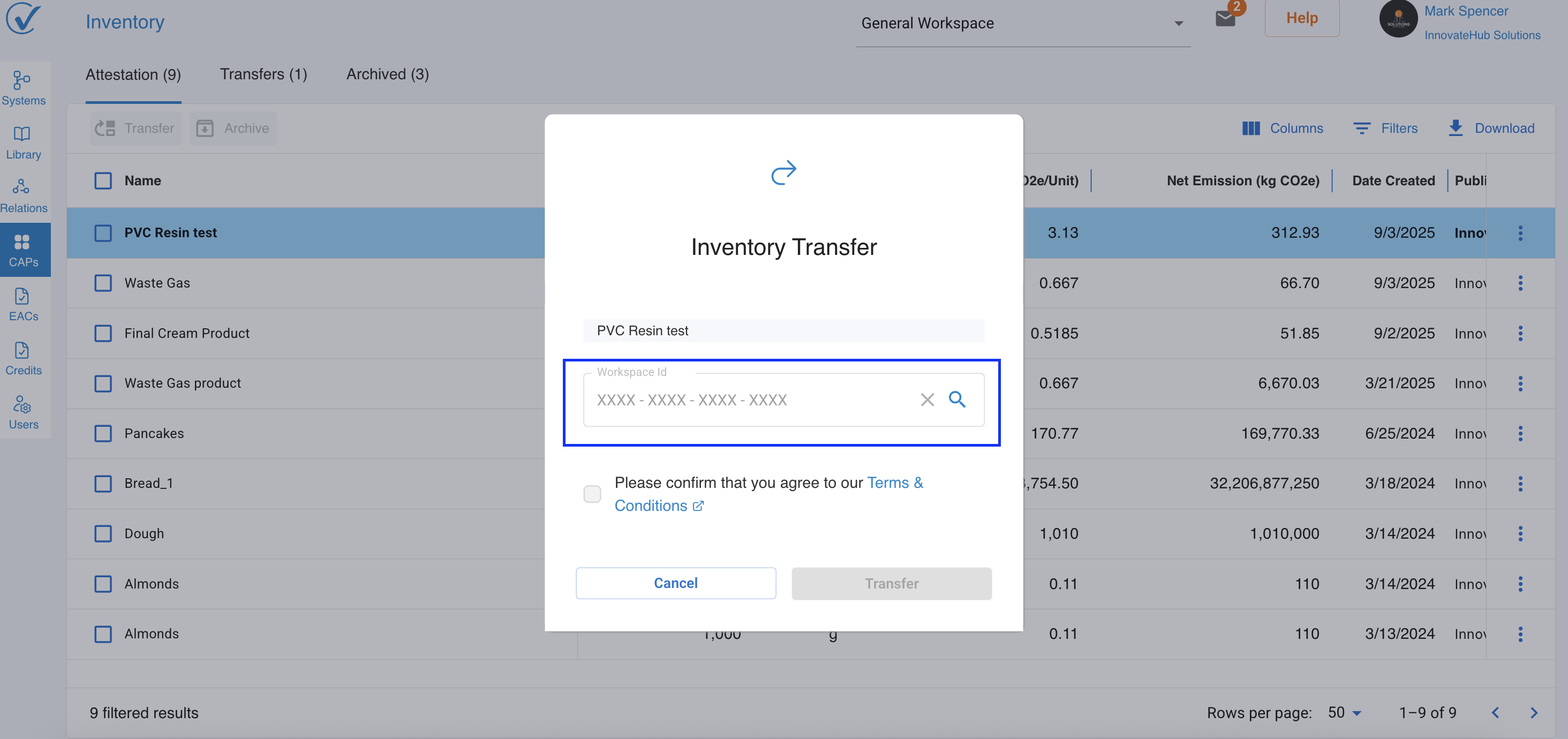 Transfer Modal Changes: Instead of entering an email, users should now enter the Workspace ID for transfers.