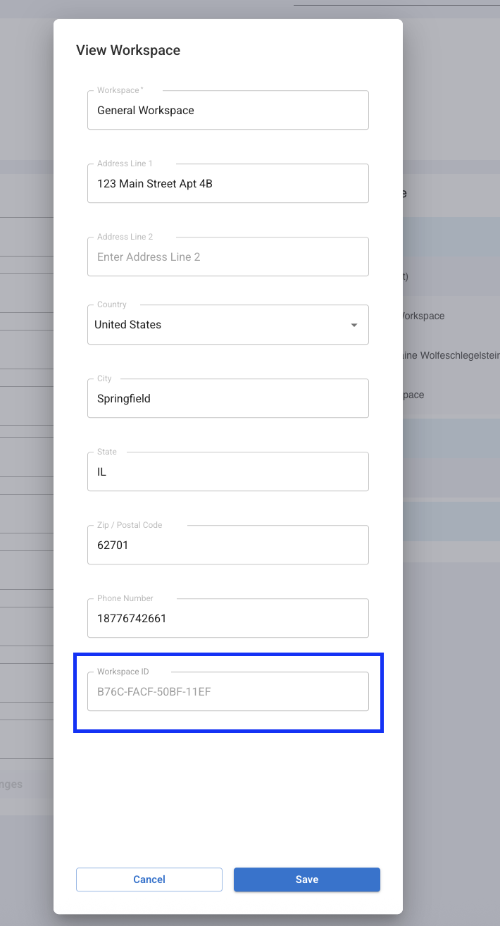 Workspace ID: In the Workspace modal, youβll find a Workspace ID formatted as a mix of letters and numbers (xxxx-xxxx-xxxx-xxxx). This ID is generated by the system when a new Workspace is created and is used during Transfers between Tenants. Note that Transfers between Workspaces within the same Account are not yet implemented.
