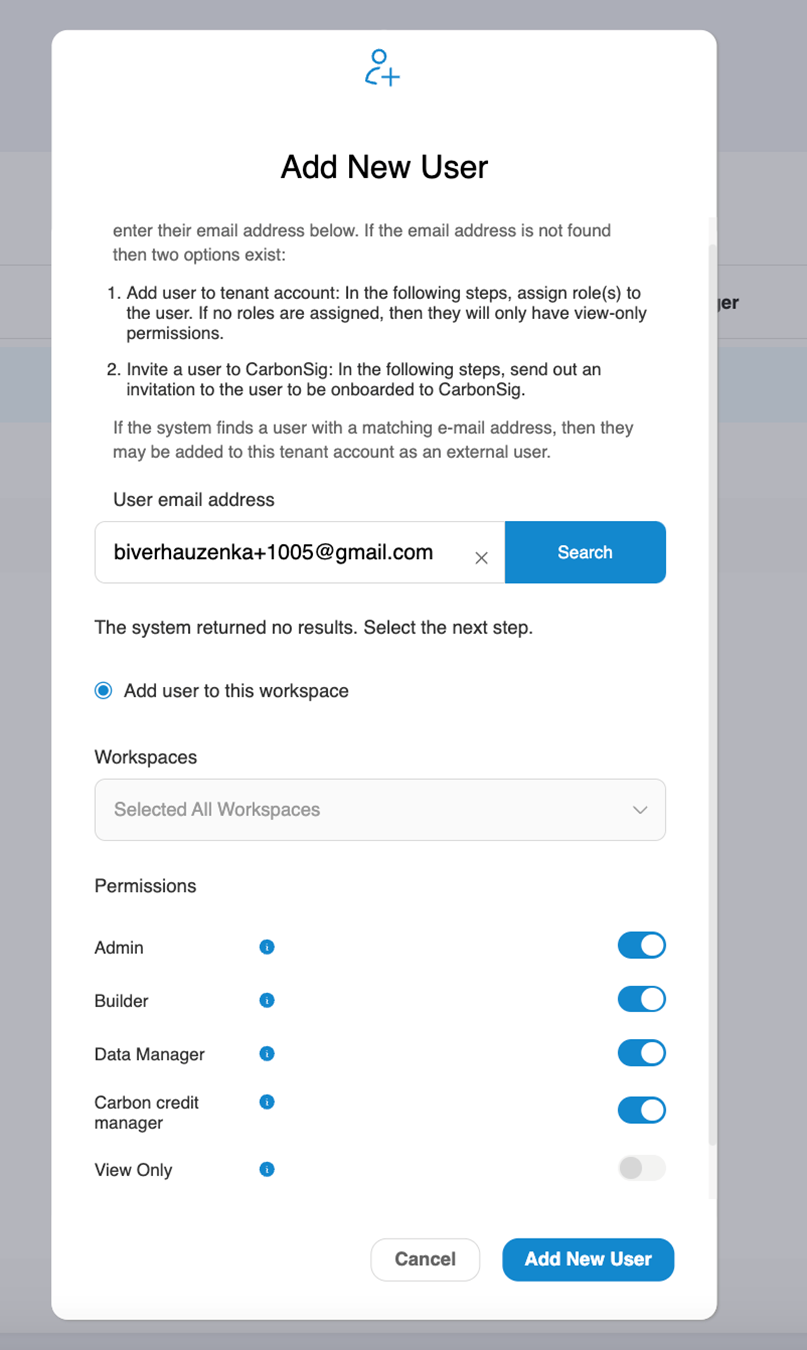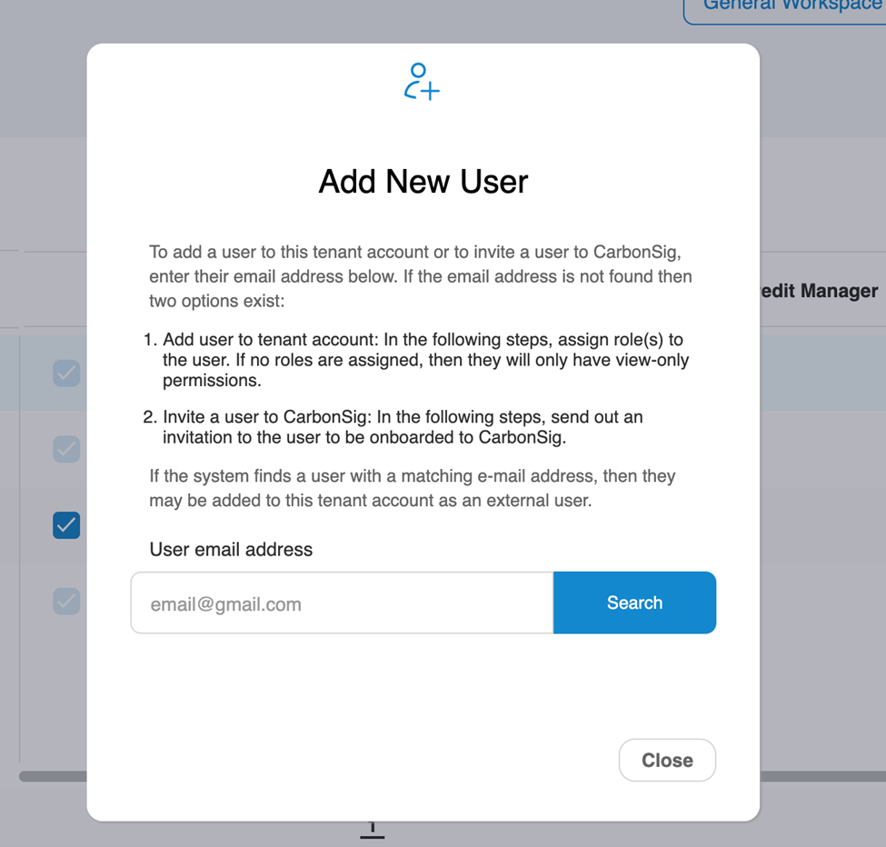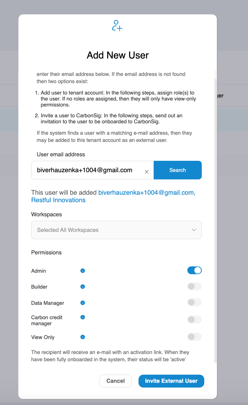 El sistema entonces verificará si el correo electrónico ya está vinculado a una cuenta existente de CarbonSig. Si es así, el usuario será agregado como usuario externo.