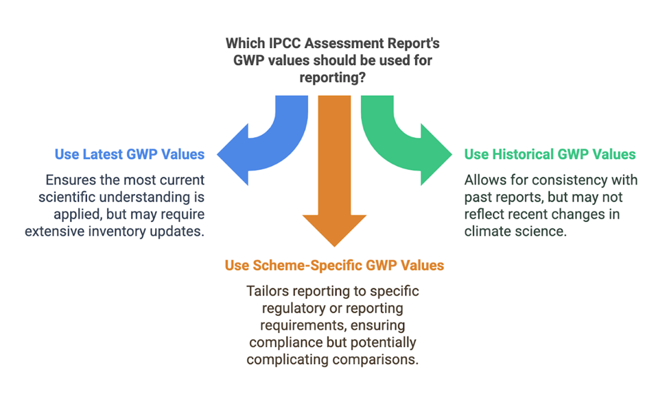 Mejor Práctica: Al reportar emisiones de gases de efecto invernadero, siempre declare claramente qué valores PCG del Informe de Evaluación del IPCC se están usando, ya que esta elección puede afectar significativamente los resultados finales.