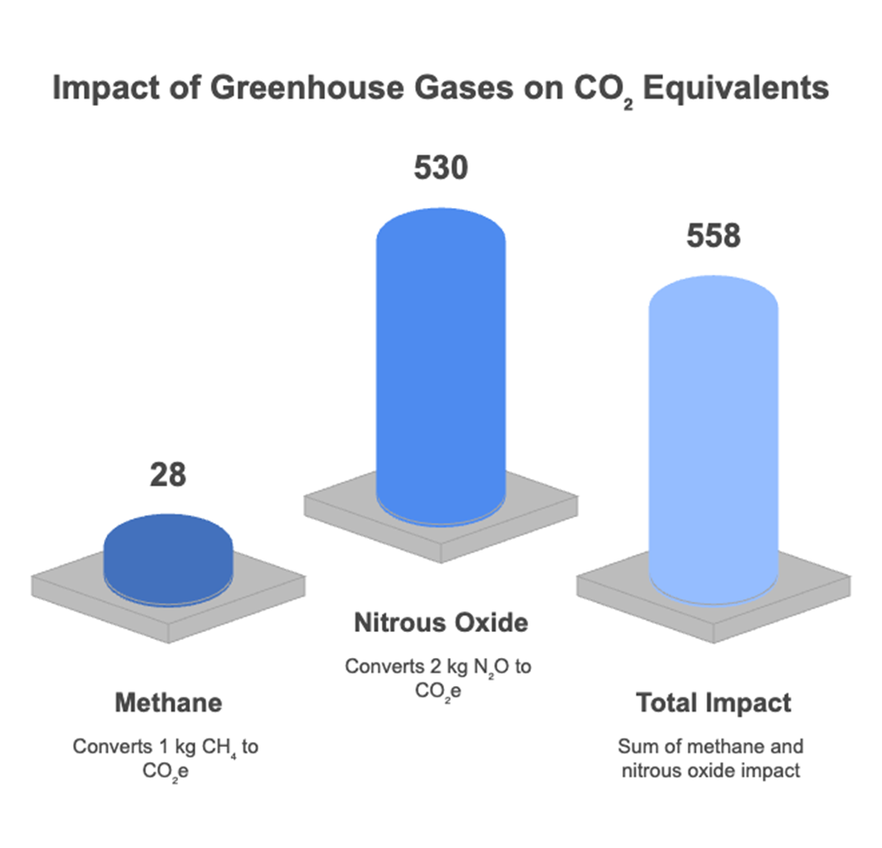 Ejemplo: Convertir metano a CO₂e 1 kg CH₄ × PCG₁₀₀ (28) = 28 kg CO₂e 2 kg N₂O × PCG₁₀₀ (265) = 530 kg CO₂e Impacto total: 558 kg CO₂e