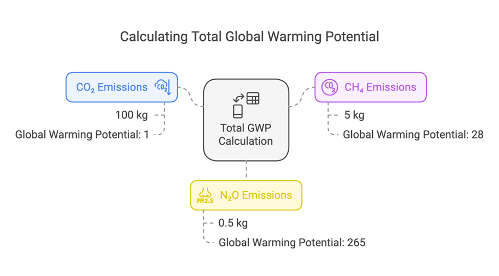 PCG₁₀₀ Total = (100 × 1) + (5 × 28) + (0.5 × 265) = 372.5 kg CO₂e