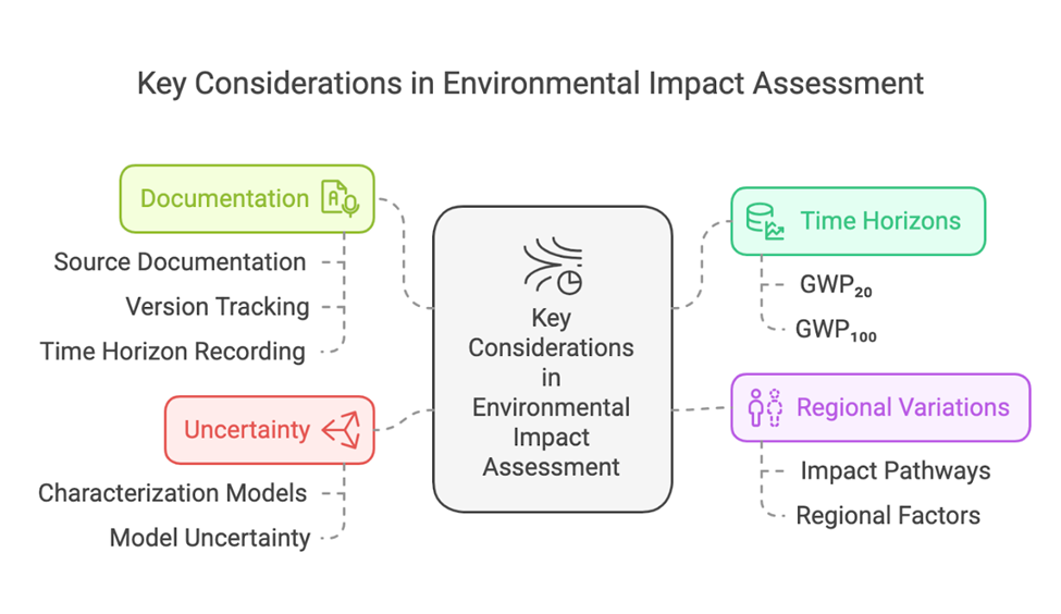Mejor Práctica: Al usar factores de caracterización, siempre documente la fuente, versión y horizonte temporal de los factores utilizados. Esto asegura transparencia y reproducibilidad de los resultados de evaluación de impacto.