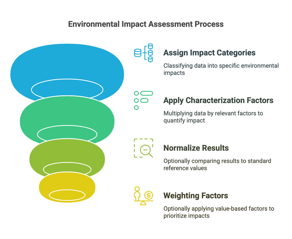 Resultados ICV → Datos de emisión brutos → Caracterización → Aplicar factores → Puntuación de Impacto → CO₂ equivalentes