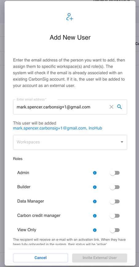 Finalmente, el Administrador hace clic en el botón "Invitar Usuario Externo". Se enviará un correo electrónico a la cuenta existente para completar el proceso de invitación.