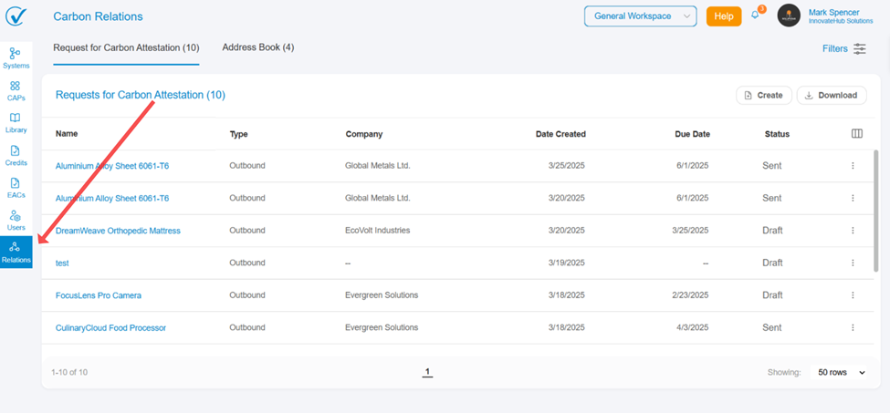 ¡Navegue a la pestaña Relaciones en su barra lateral de navegación CarbonSig para comenzar a gestionar sus relaciones de proveedores y solicitudes de información de carbono de manera más eficiente!